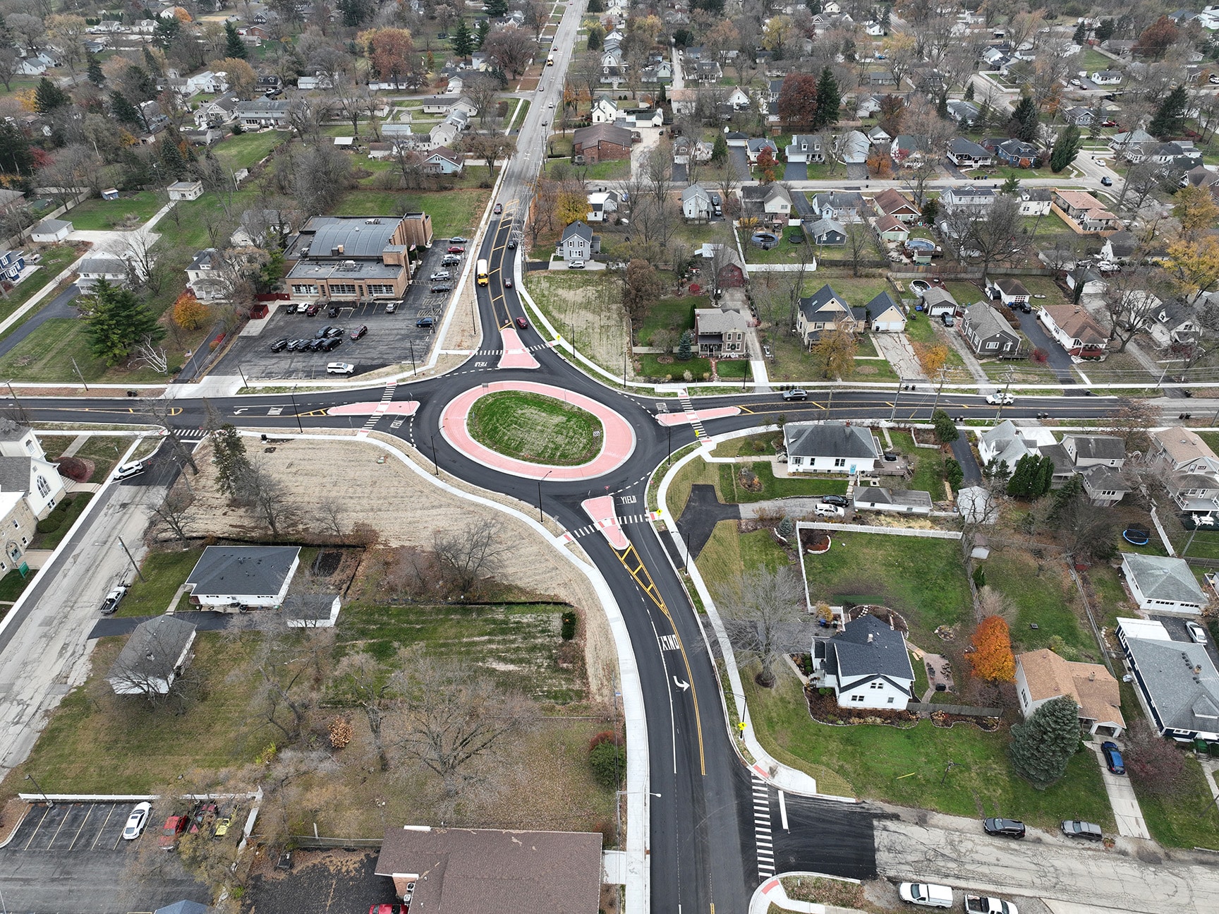 Traffic on Cedar Road is projected to increase by about 53% by 2050 (from 12,300 vehicles per day today to 18,800). The single-lane urban elliptical roundabout is expected to accommodate future traffic volumes while improving safety and overall intersection operations for motorists and pedestrians. The concept also creates opportunities for landscaping and supports objectives identified in the Village’s Comprehensive Plan.