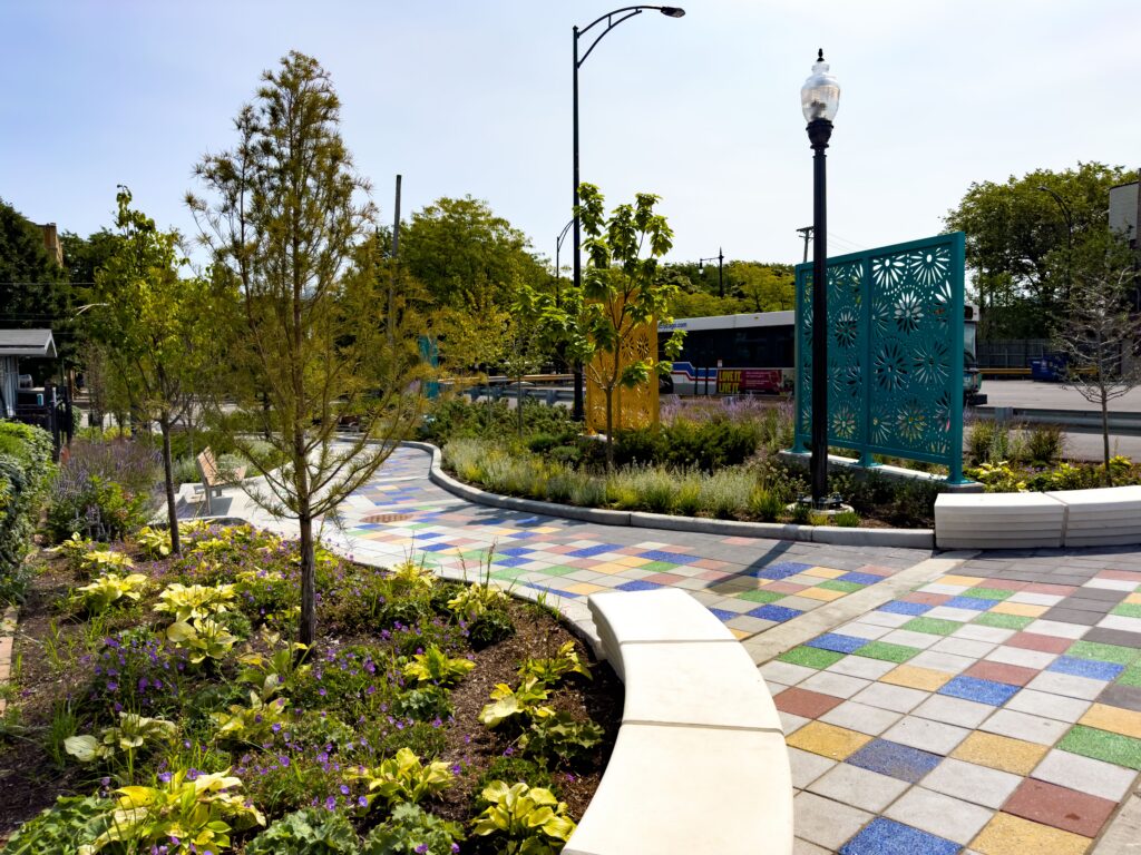 The improvements included new decorative lighting, ADA enhancements, driveway and bus stop upgrades, and buffered bike lane connections south of Devon. Other improvements included plaza replacement and streetscape enhancements designed to strengthen the character and usability of the surrounding open spaces.