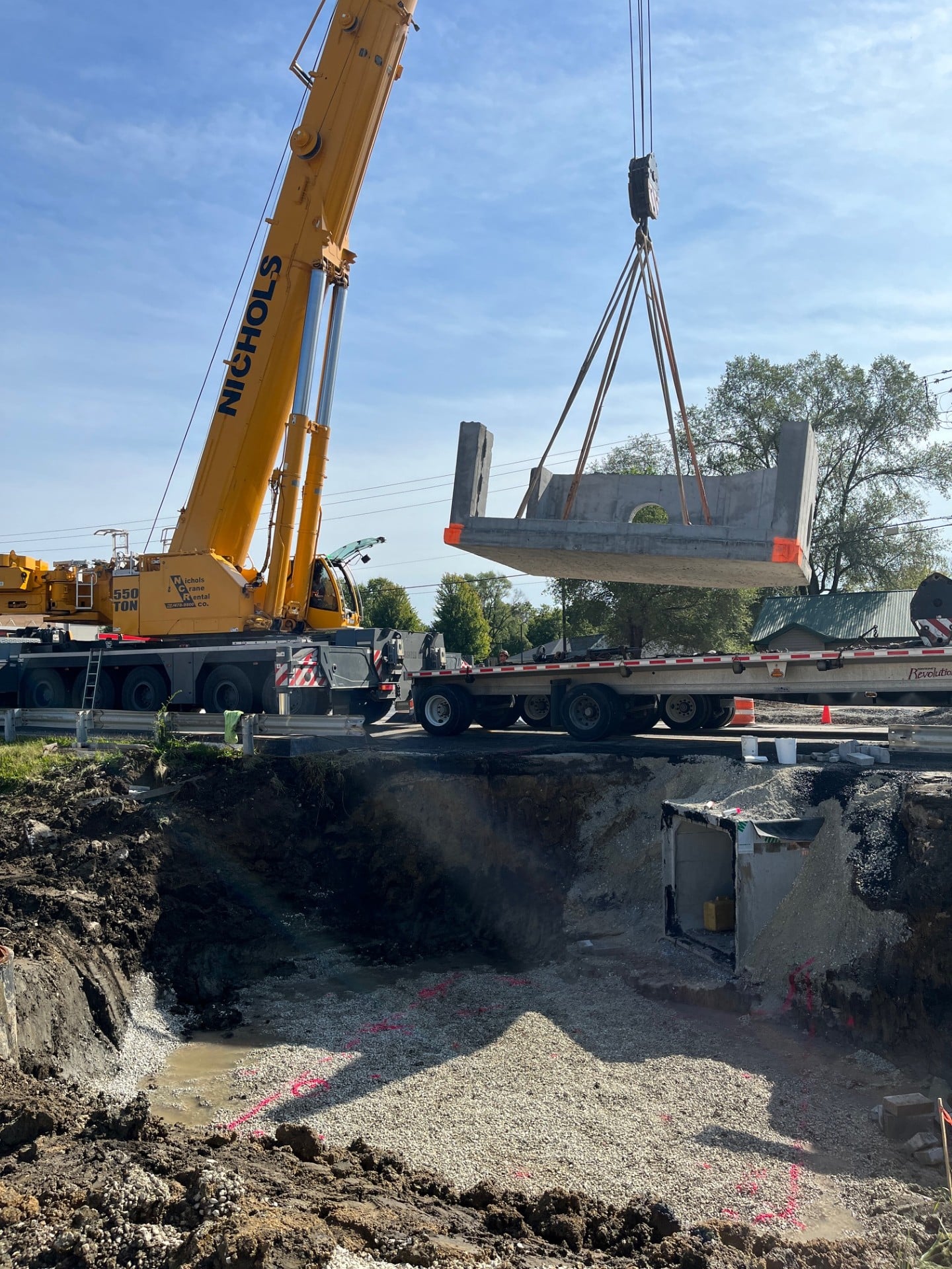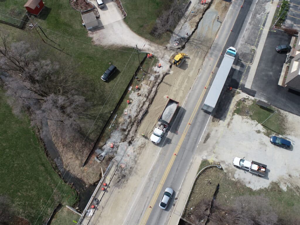 Utility coordination was extensive and included AT&T, Nicor, Verizon, and ComEd. Work also included installation of approximately 5,000 feet of 12-inch ductile iron water main to replace aging six-inch pipes and improve fire flows, plus a pressure-reducing valve at Summit Drive to regulate water pressure zones. Stormwater improvements included replacement of an 84-foot 5’x5’ box culvert under IL 7, a 254-foot dual 7’x4’ box culvert ditch enclosure, and approximately 4,170 feet of new storm sewer.